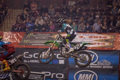 Irvine, Calif. (February 19, 2014) – The seventh round of AMA Arenacross saw two nights of racing at Idaho Center in Nampa, Idaho. Team Babbitt’s Monster Energy/Amsoil Kawasaki’s Tyler Bowers raced to his fifth overall win on Friday by tying with Zach Ames. Bowers was rewarded the overall by winning the second main event and the head-to-head bracket races for additional championship points. Saturday night saw Ames win the first main event and finish third overall with a 1-5 score, while Bowers stayed consistent to take second overall finishing 2-3. Colt Nichols held his spot in the top-10 championship standings by finishing sixth on Friday and eighth on Saturday. Vicki Golden joined Team Babbitt’s in Nampa and qualified for both the Arenacross and Arenacross Lites class and scored her first point.